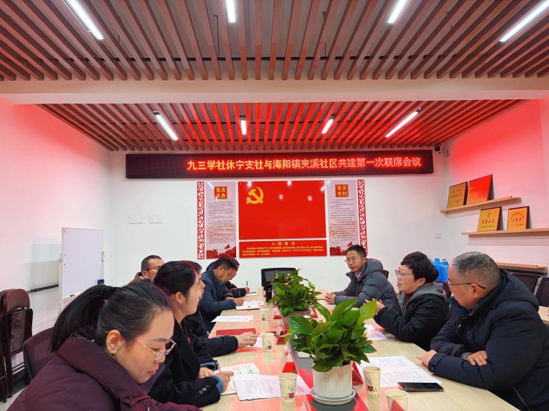 为进一步发挥九三学社专业人才优势和社会资源优势,助力城市社区高质量发展,2月7日,九三学社休宁支社与海阳镇夹溪社区共建第一次联席会议召开。休宁县政协副主席、九三学社休宁支社主委余支越,县委社工部部长李向荣,海阳镇人大副主席周光耀,夹溪社区党总支书记王蔚琳等出席会议。